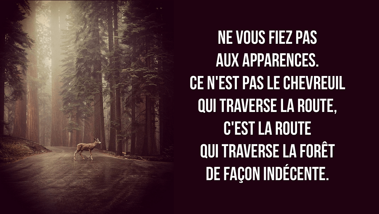Stop. Réfléchissons. Toutes les sensations que je perçois ne viennent que d’une seule source : la civilisation. Lorsque vous aurez terminé ce paragraphe, posez le livre un moment, et observez autour de vous. Que voyez-vous, qu’entendez-vous, que sentez-vous, que ressentez-vous, que goûtez-vous qui ne tire pas son origine ou ne soit transmis par des humains civilisés ? Le chant des grenouilles sur un CD de Sons de la Nature ne compte pas.