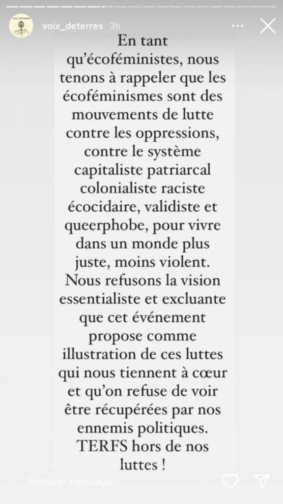 La Maison de l’écologie de Lyon, qui devait accueillir une conférence écoféministe conjointement organisée par des femmes de Deep Green Resistance France (DGR) et de Floraisons le week-end des 19 et 20 novembre, a finalement décidé d’annuler l’évènement (qui se tiendra tout de même, mais ailleurs). L’équipe qui dirige la Maison de l’écologie lyonnaise en a décidé ainsi après avoir reçu un grand nombre de virulents messages lui intimant de ne surtout pas recevoir les « transphobes », « validistes », « eugénistes », « écofascistes », « conspirationnistes », « putophobes », « racistes », j’en passe et des meilleurs, de chez DGR et Floraisons. Les bénévoles qui s’occupent de la maison de l’écologie ont même été personnellement visés.