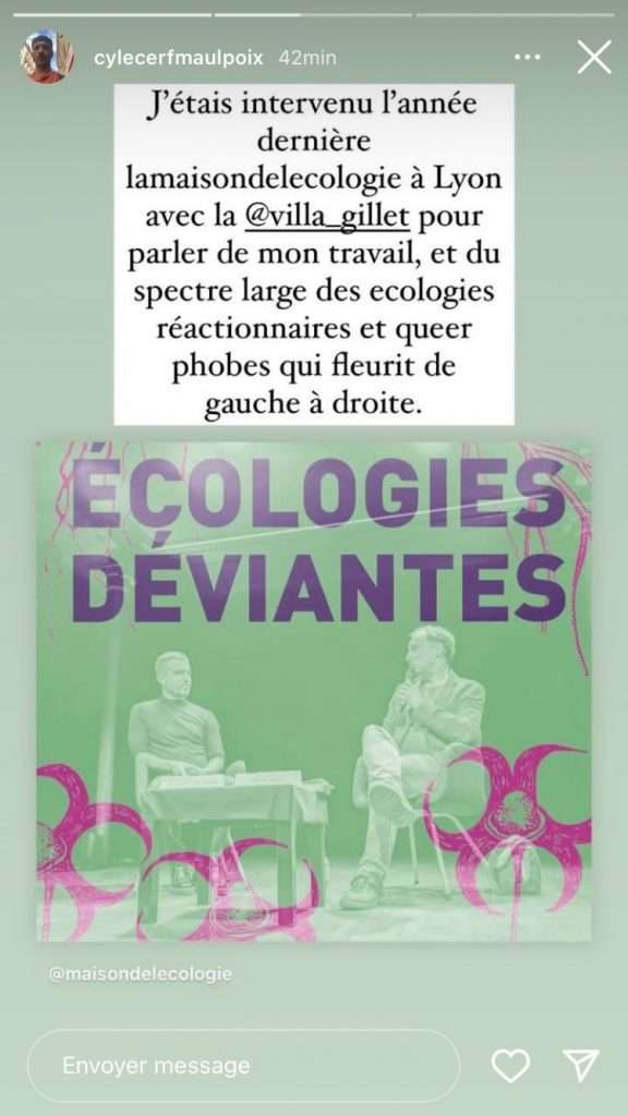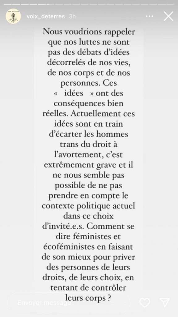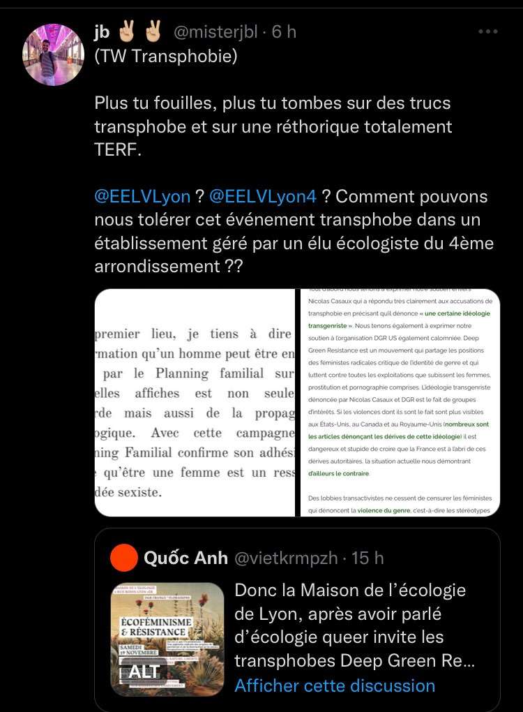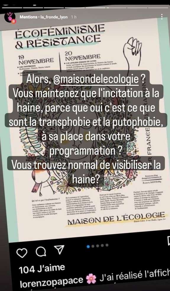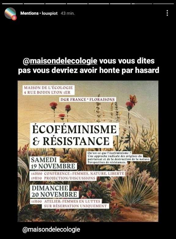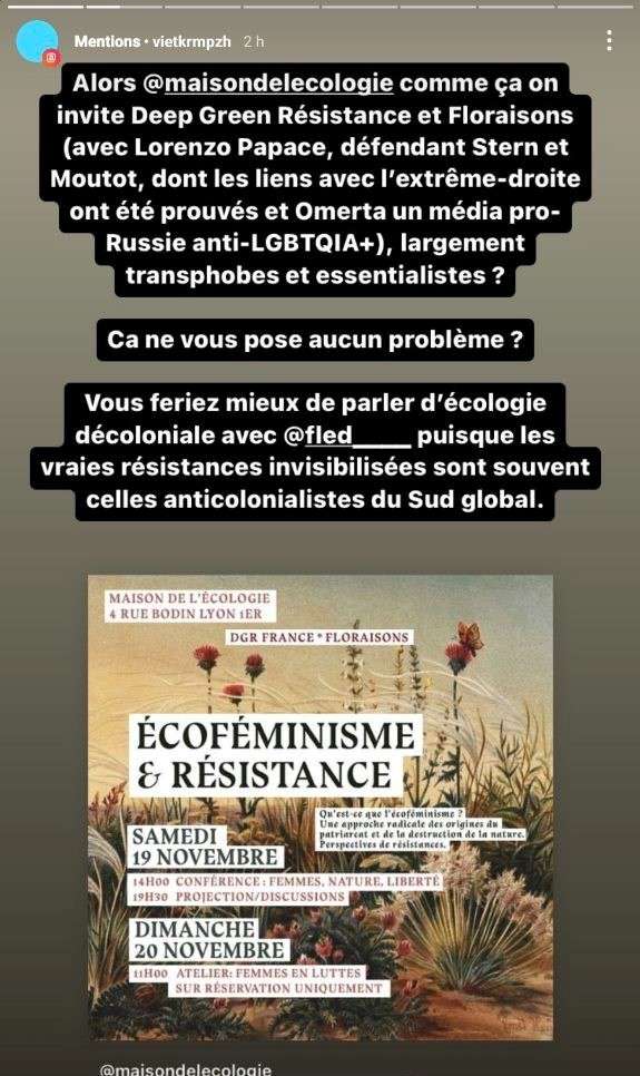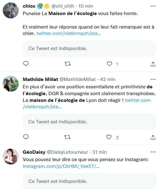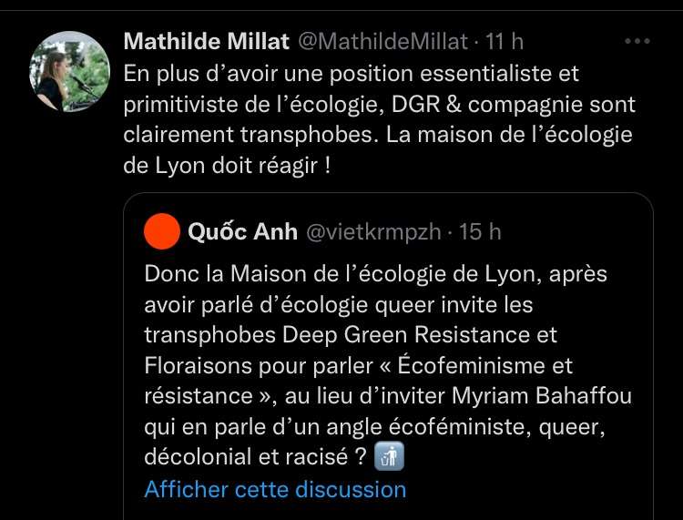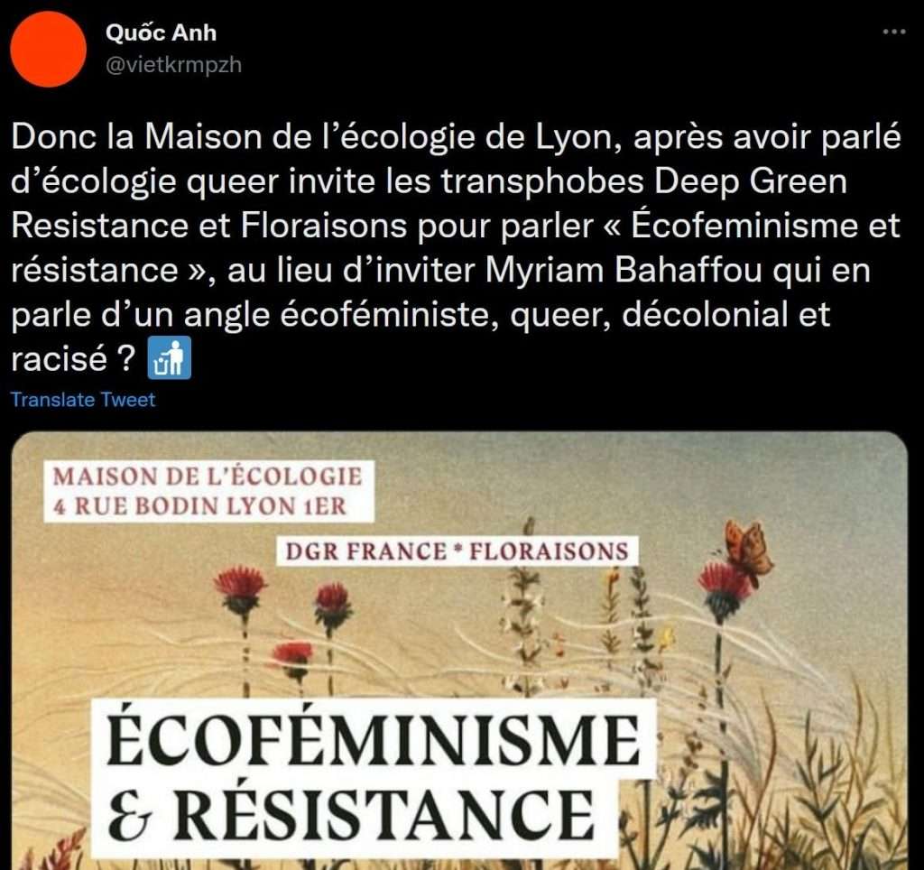 La Maison de l’écologie de Lyon, qui devait accueillir une conférence écoféministe conjointement organisée par des femmes de Deep Green Resistance France (DGR) et de Floraisons le week-end des 19 et 20 novembre, a finalement décidé d’annuler l’évènement (qui se tiendra tout de même, mais ailleurs). L’équipe qui dirige la Maison de l’écologie lyonnaise en a décidé ainsi après avoir reçu un grand nombre de virulents messages lui intimant de ne surtout pas recevoir les « transphobes », « validistes », « eugénistes », « écofascistes », « conspirationnistes », « putophobes », « racistes », j’en passe et des meilleurs, de chez DGR et Floraisons. Les bénévoles qui s’occupent de la maison de l’écologie ont même été personnellement visés.